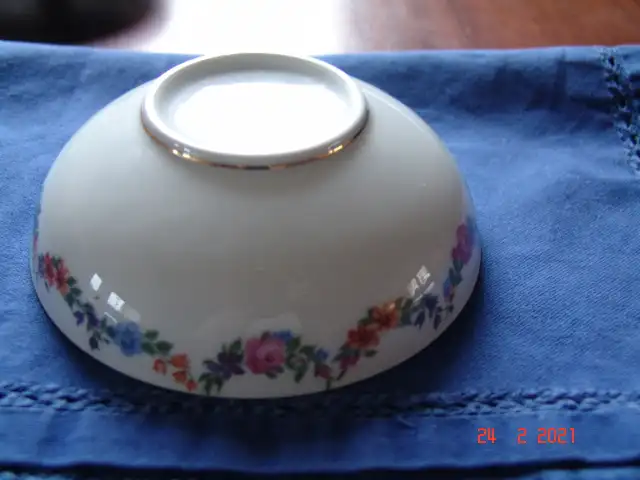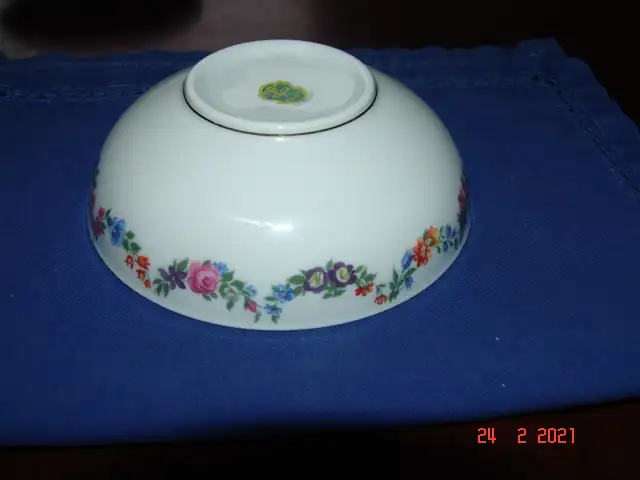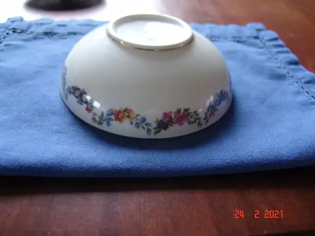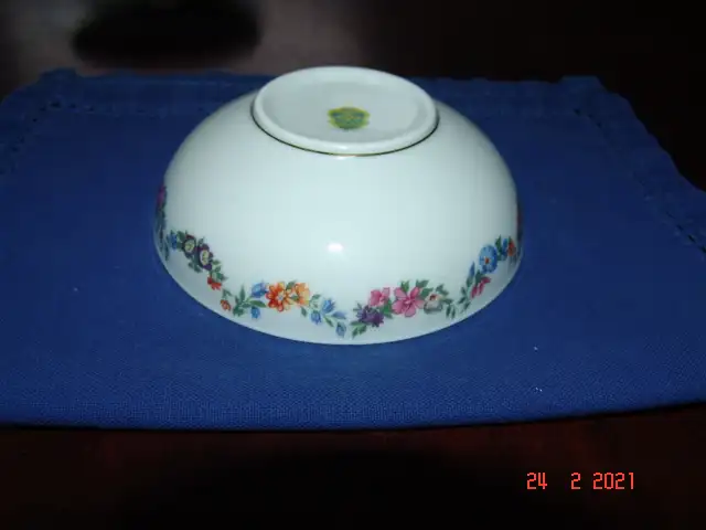 Die Schale ist in sehr gutem Zustand. Das Blütendekor ist ohne Abrieb, der Goldrand am oberen Schalenrand ist etwas berieben.