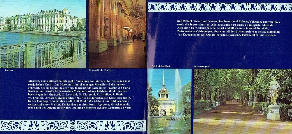 guter Zustand, Gebrauchs- und Alterungsspuren: Vorderseite rechts oben eselsohrig und etwas knittrig - Rückseite stark beschabt und mit vielen kleinen Druckstellen von kleinen Steinen, Druckstellen teils auch auf den Seiten zuvor sichtbar, Werbeprospekt für die wunderschöne Stadt in deutscher Sprache "Aeroflot lädt Sie zu einem Besuch Leningrads, einer der schönsten Städte unseres Planeten, ein! Über 100 Millionen Fluggäste befördert jährlich Aeroflot, die größte Luftfahrtgesellschaft der Welt! Die Gesamtlänge der Linien, die die sowjetische Fluggesellschaft befliegt, übersteigt eine Million Kilomer. Über 90 Länder der Welt sind mit der UdSSR durch Aeroflot-Linien verbunden. Aus Asien, Afrika und Amerika können Sie über Moskau, einem der größten Zentren der internationalen Luftfahrtverbindungen, nach Leningrad fliegen. 25 Städte Europas sind durch direkte Aeroflot-Linien mit Leningrad verbunden. Aeroflot-Maschinen befördern Sie in die herrliche Stadt an der Newa aus Amsterdam, Athen, Belgrad, Budapest, Bratislava, Burgas, Berlin, Warschau, Wien, Varna, Hamburg, Gdansk, Dresden, Kopenhagen, London, Luxemburg, Mailand, Oslo, Paris, Prag, Sofia, Stockholm, Tampere, Helsinki und Zürich ...", Softcover, ca. 20 x 18,5, 16 Seiten mit 22 Bildern und 1 Kartenskizze