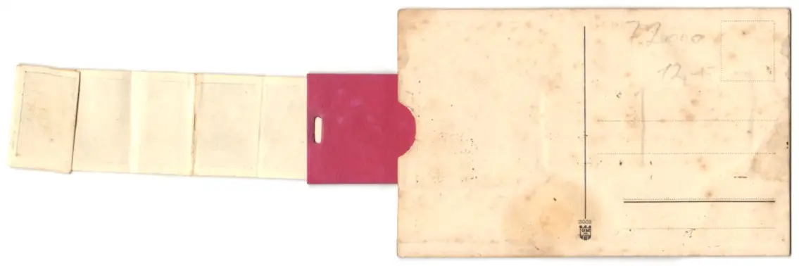 Personenbezogene Daten auf der Rückseite der Karte wurden durch blauen Textmarker unkenntlich gemacht. Die blauen Stellen sind auf die Vorderseite durchgeweicht und wirken sich negativ auf das Postkartenfoto aus