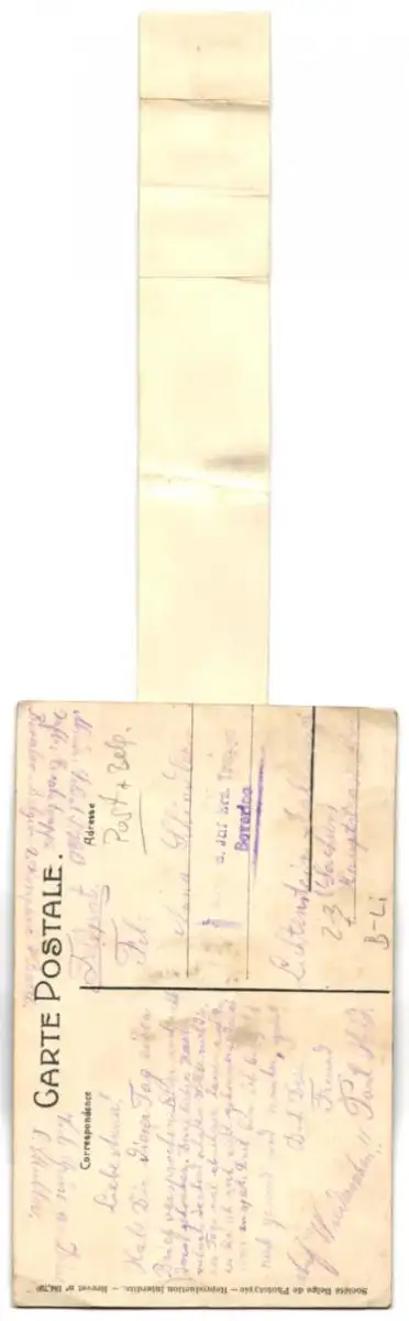 Personenbezogene Daten auf der Rückseite der Karte wurden durch blauen Textmarker unkenntlich gemacht. Die blauen Stellen sind auf die Vorderseite durchgeweicht und wirken sich negativ auf das Postkartenfoto aus