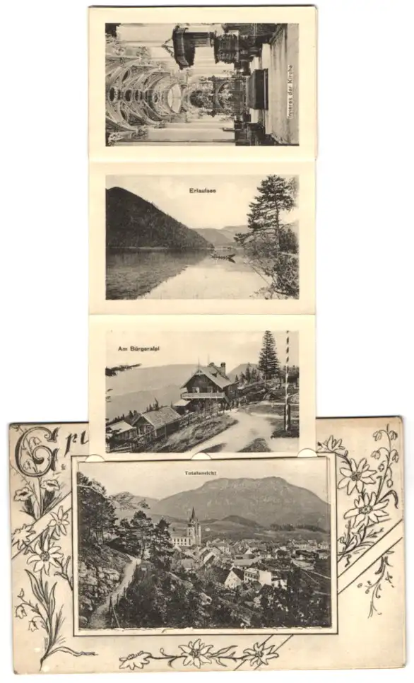 Leporello-AK Mariazell, Totalansicht, Marienfall, Innenansicht der Kirche, Bürgeralpl