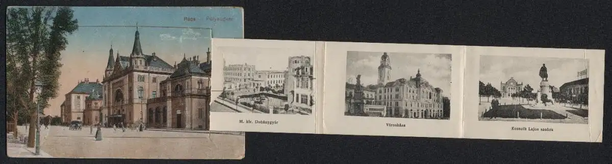 Leporello-AK Récs, Pályaudvar, Kossuth Lajos szobra, Városháza, Irgalmas-Utca