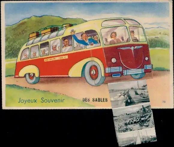 Leporello Ak Les Sables d'Olonne Vendée, Strand, Reisebus