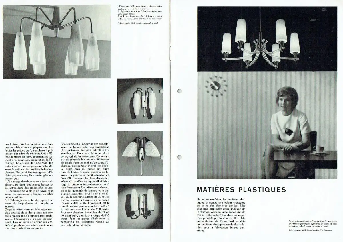 guter Zustand, Gebrauchs- und Alterungsspuren: teils mit Randblessuren - gelocht - teils etwas knittrig - Umschlag oben je 1x ca. 1 cm eingerissen - leichter Klammerrost - Seiten sauber und ordentlich, Ex oriente Lux in französischer Sprache Opéra de Leipzig - "Szeged" - Eclairage d'appartement - Matères Pastiques - Luminaires en Bois vom VEB Leuchtenbau Leipzig, VEB Raumleuchte Zeulenroda und dem VEB Leuchtenbau Lengefeld, Softcover, ca. 21 x 29,5, 16 Seiten mit 30 Bildern