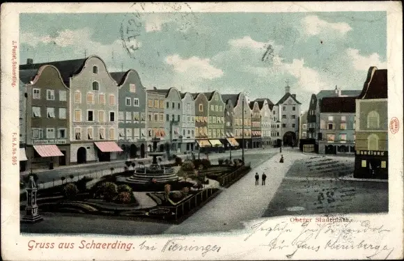 Leuchtfenster Golden Windows Ak Schärding in Oberösterreich, Oberer Stadtplatz, Brunnen, Geschäfte