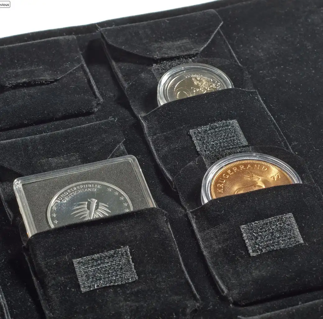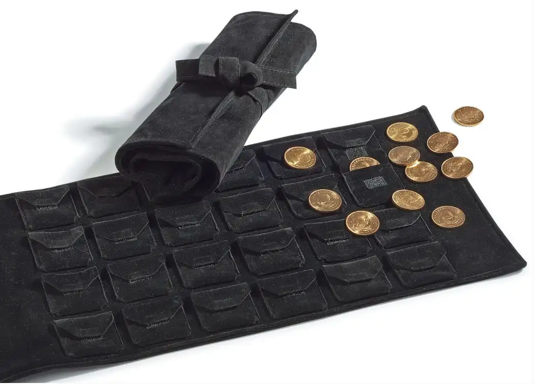 Die Münzrolle ist aus hochwertigem, weichem, samtähnlichem Textilmaterial gefertigt und besitzt 2 Verschlußbänder. Sie können darin 24 Münzen bis zu einem Durchmesser von 50 mm aufbewahren. Auch Münzkapseln, QUADRUM-Münzkapseln oder Münzrähmchen können aufgenommen werden. Die Münzrolle eignet sich insbesondere als Transporttasche oder für die Aufbewahrung in einem Schließfach oder Tresor. Maße (offen): 600 x 300 mm