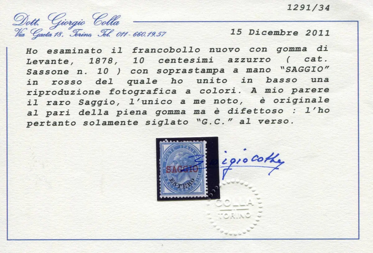 Levante Italiano - Vitt. Emanuele II Cent. 10 hellblau mit Handaufdruck Essage mit Spur von Linguella - Levante Italiano - Vitt. Emanuele II Cent. 10 hellblau Nr. 10 mit Handaufdruck Essay in rot - Briefmarke defekt aber es ist das einzige bekannte Exemplar - Selten - Zert. Kleber Code 913/8