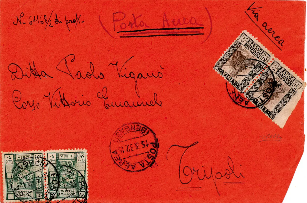 BÜSTE - Libyen - Pittorica Cent. 30 n. 63g ungezähntes Paar links auf Luftumschlag von Bengasi nach Tripolis am 15.3.32 mit Zusatzfrankatur - Einziges bekanntes Exemplar zitiert aus dem sächsischen Katalog - Zert. G. Colla - Kat. euro 22.000 Cod.1050/182