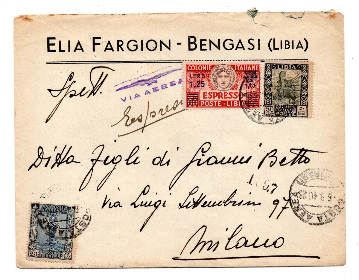 Libyen - Espresso Nr. 17 + P.O. Ergänzungen 49 + 51 auf Luftumschlag exp. von Bengasi nach Mailand am 6.9.40 - Selten - Kat. euro 165 n. 979/18