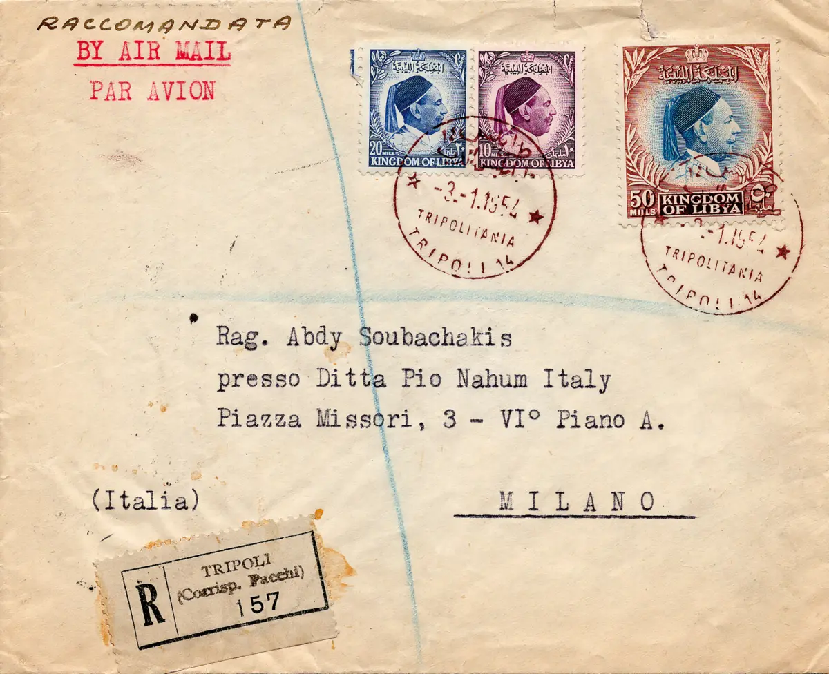 BEUTEL - Libyen Unabhängiges Königreich - König Idriss 50 M. Nr. 42 + Ergänzungen Nr. 38 + 40 auf Umschlag Racc. mit dem Flugzeug von Tripolis nach Mailand am 3.11.54 - Abflug Ann. rot zweisprachig Tripolis 14 - Uncommon Cod.1073/182