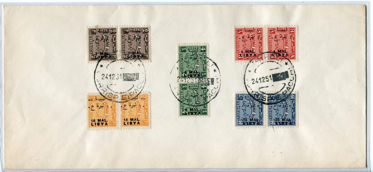 Libyen Unabhängiges Königreich - Aufgedruckte Steuermarken mit Neuwert in MAL, Ausgabe für Tripolitanien, Nr. 8/12 zwei komplette Serien paarweise am 1. Ausgabetag auf Umschlag storniert - Bewertung als gebraucht Euro 800 Cod. 957/15