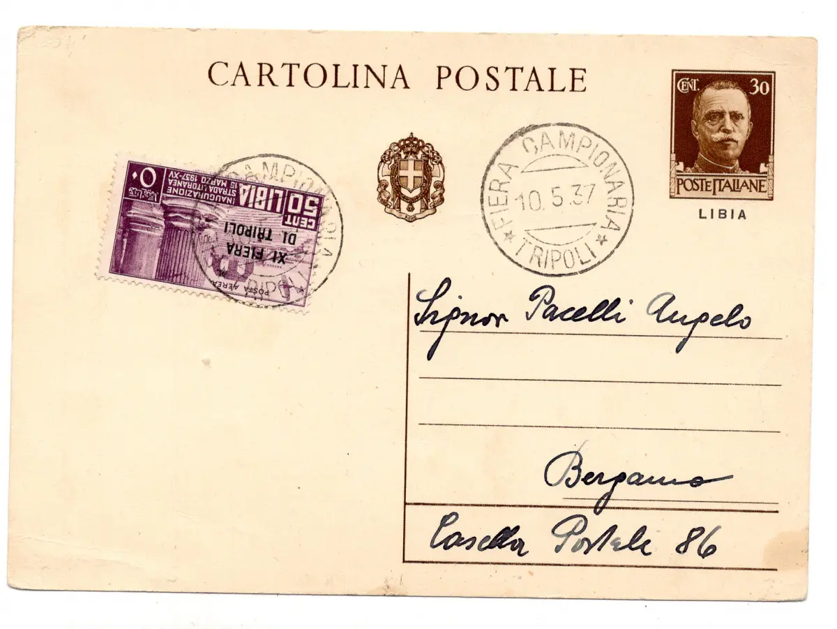 Postkarte - Libyen - XI Luftpostmesse Cent. 50 Nr. 32 auf Postkarte Cent. 30 Imperiale reiste am 10.5.37 von Tripolis nach Bergamo - ab Jahrgang guller der Mustermesse - Ungewöhnlich - Kat. euro 180 Cod. 1078/17
