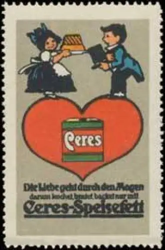 Die Liebe geht durch den Magen, darum kochet, bratet, backet nur mit Ceres-Speisefett., Größe/Zustand: 6x4 , guter Zustand, Original alte Reklamemarke die seinerzeit für die Werbung benutzt wurde