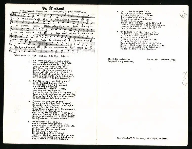 Lied-AK Anton Günther Nr.: Da Of`nbank, Text und Noten