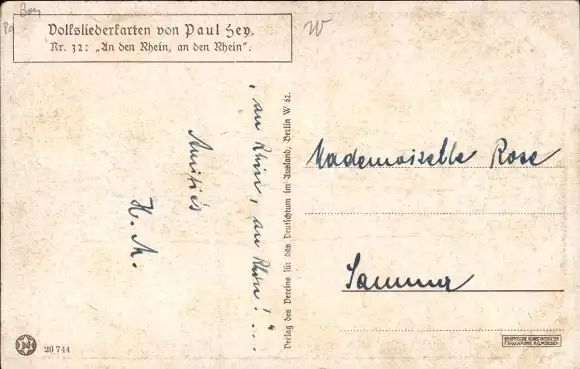 Lied Künstler Ak Hey, P., An den Rhein, an den Rhein, Volksliederkarte Nr. 32