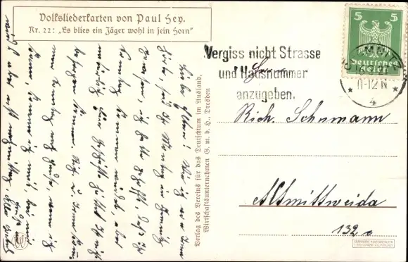 Lied Künstler Ak Hey, Paul, Volksliedkarte Nr. 22 Es blies ein Jäger wohl in sein Horn