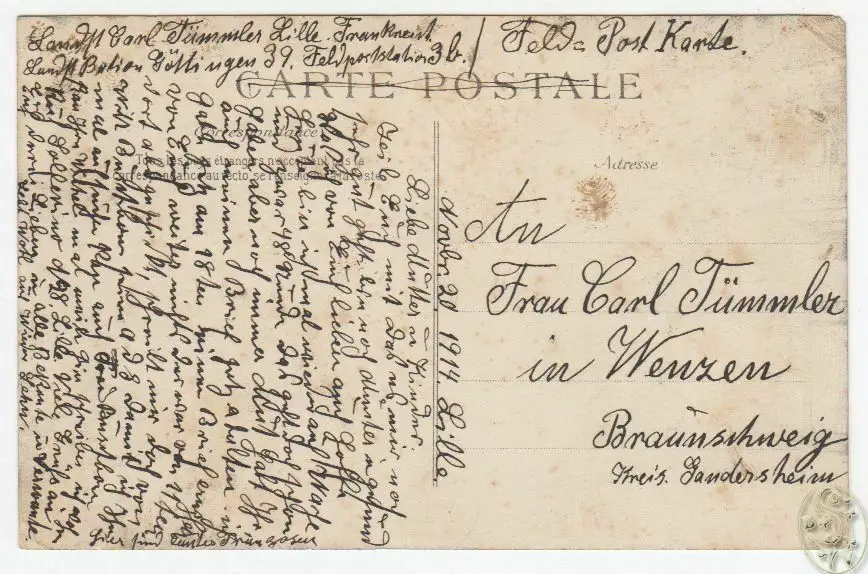Bemerkungen: Diese Ansichtskarte wurde am 20. November 1914 als Feld-Postkarte des Soldaten Carl Tümmler des Landsturmbatallion Göttingen 39 geschrieben.