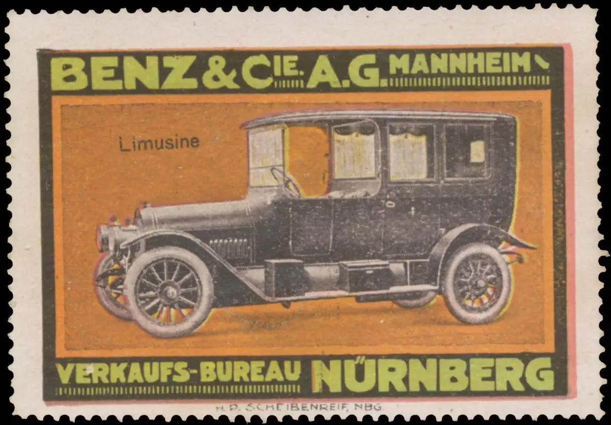 Auto, Verkaufsbüro Nürnberg, Druck: H.P. Scheibenreif, Nürnberg, Größe/Zustand: 5x7 , guter Zustand, Original alte Reklamemarke die seinerzeit für die Werbung benutzt wurde