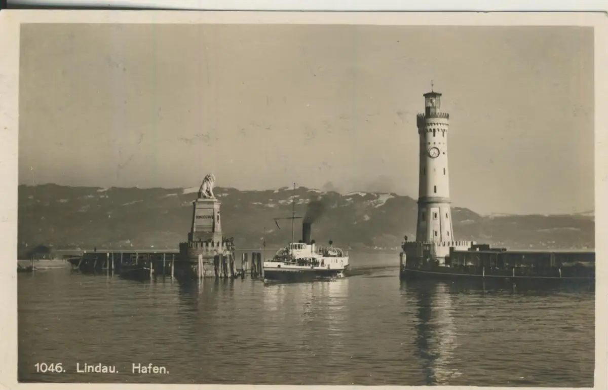 Lindau v. 1933 Hafeneinfahrt mit einen Bodenseedampfer (AK1450)