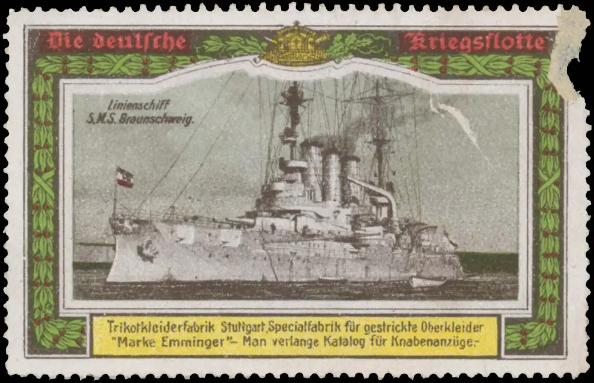 "Die deutsche Kriegsflotte, Marine-Reklamemarken ""Deutschlands Kriegsflotte"", 48 Kriegsschiffe in 6 Serien sind in Strumpf-Wollmanufakturwaren- und Konfektionsgeschäften, welche gestrickte Oberkleider ""Marke Emminger"" führen, zu haben.", Größe/Zustand: 4x7 , beschädigt, Original alte Reklamemarke die seinerzeit für die Werbung benutzt wurde