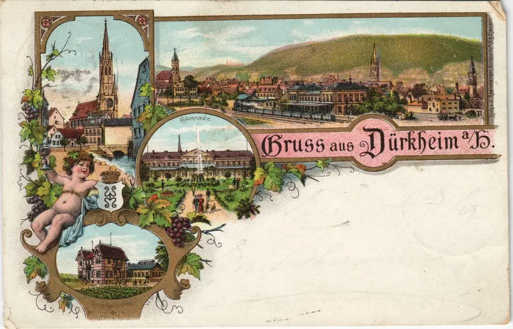 Litho AK Bad Dürkheim MB: Bahnhof, Kirche, Collonade - Engel 1900