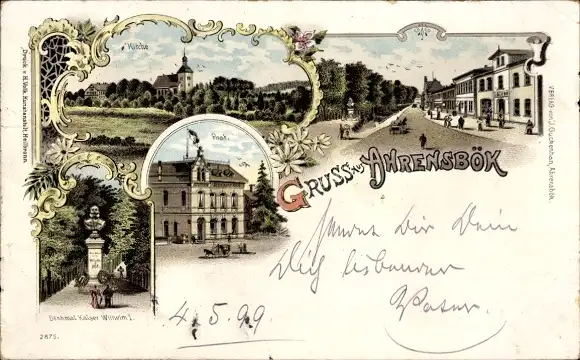 Litho Ahrensbök in Ostholstein, Kirche, Post, Kaiser Wilhelm I. Denkmal