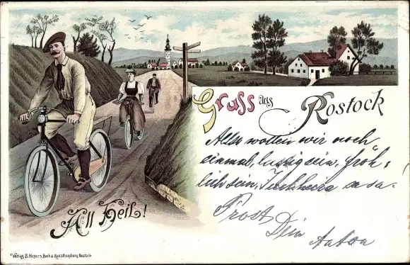 Litho All Heil, Radfahrer, Gruß aus Rostock