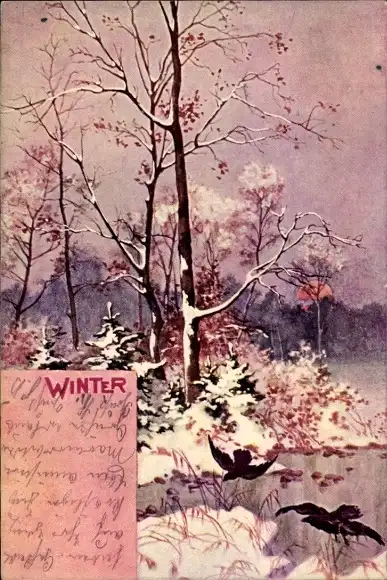 Litho Allegorie, Winter, Landschaft, kahle Bäume