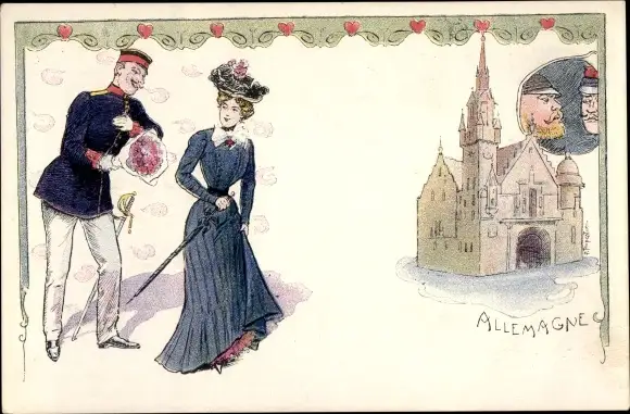 Litho Allemagne, Französischer Soldat überreicht einer Frau einen Blumenstrauß