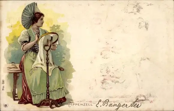 Litho Appenzell, Frau in schweizerischer Tracht beim Sticken