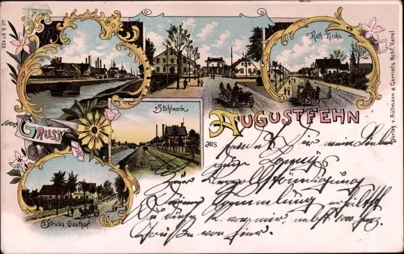 Litho Augustfehn Apen in Oldenburg Ammerland, Kirche, Stahlwerk, Gasthof