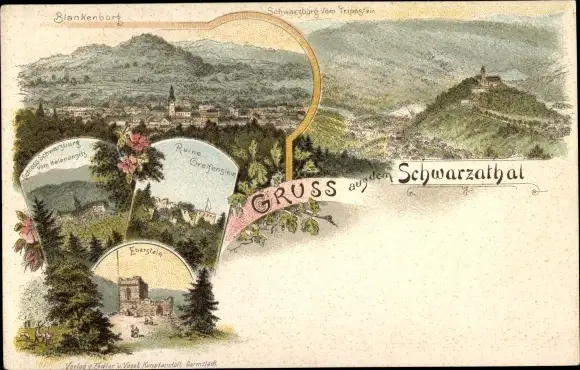 Litho Bad Blankenburg in Thüringen, Schwarzatal, Ruine Greifenstein, Eberstein, Blick vom Trippstein