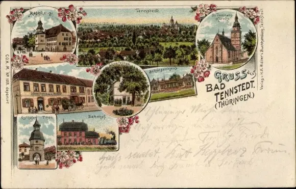 Litho Bad Tennstedt in Thüringen, St. Trinitatis Kirche, Schützenhaus, Bahnhof,Osthofer Tor,Gasthaus