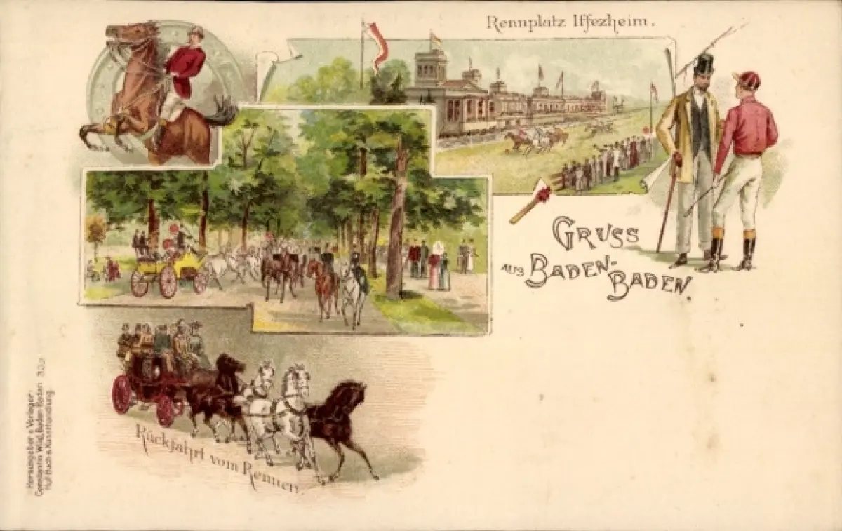Litho Baden Baden am Schwarzwald, Rennplatz Iffezheim, Jockey, Pferdekutsche