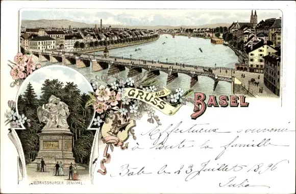 Litho Bâle Basel Stadt Schweiz, Rheinbrücke, Straßburger Denkmal
