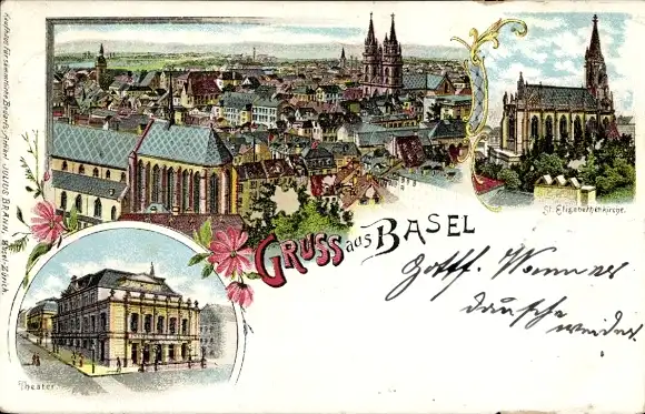 Litho Basel Bâle Stadt Schweiz, Kaufhaus, Theater, St. Elisabethenkirche