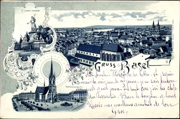 Litho Basel Stadt Schweiz, Panorama, Kirche, Denkmal