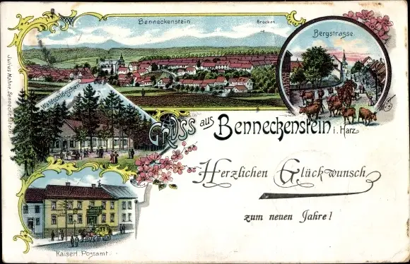 Litho Benneckenstein Oberharz, Bergstraße, Rinder, Postamt, Waldscchlösschen, Totalansicht