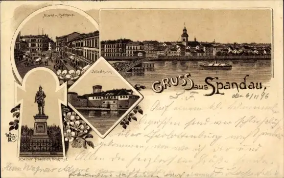 Litho Berlin Spandau, Markt mit Rathaus, Juliusturm, Kaiser Friedrich Denkmal, Total