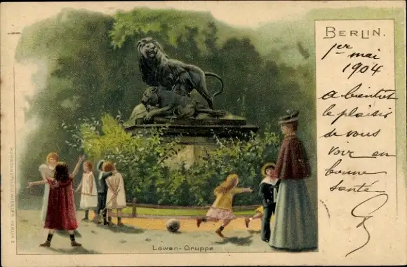 Litho Berlin Tiergarten, Löwengruppe, spielende Kinder