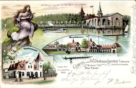 Litho Berlin Treptow Niederschöneweide, Wirtshaus Loreley, Bootshäuser, Spree