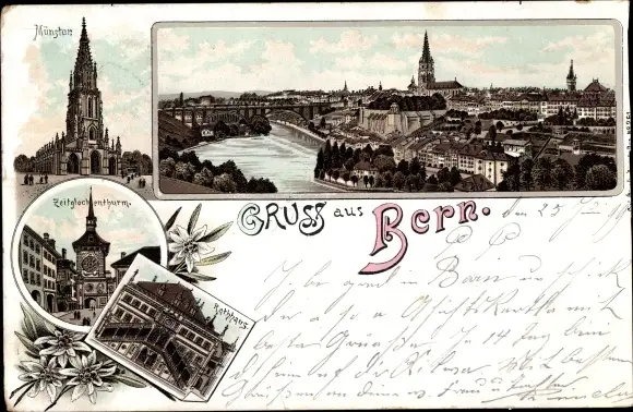 Litho Bern Stadt Schweiz, Münster, Zeitglockenturm, Rathaus, Totalansicht