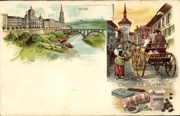 Litho Bern Stadt Schweiz, Teilansicht, Kutsche, Chocolat Suchard, Reklame