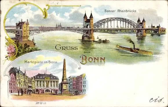 Litho Bonn am Rhein, Rheinbrücke, Marktplatz