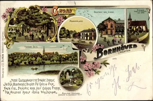 Litho Bornhöved in Holstein, Gasthof zur Linde, Teich, Adolphs Denkmal, Waldkater, Kirche