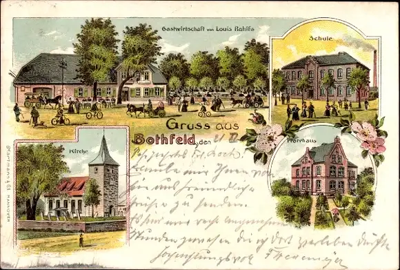 Litho Bothfeld Hannover, Gastwirtschaft Louis Rahlfs, Schule, Pfarrhaus, Kirche