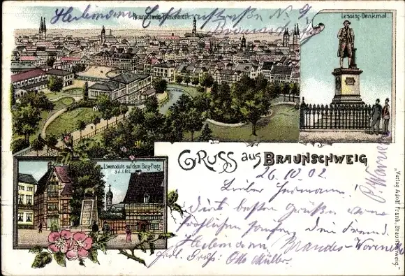 Litho Braunschweig in Niedersachsen, Gesamtansicht, Lessing-Denkmal, Löwensäule, Burgplatz
