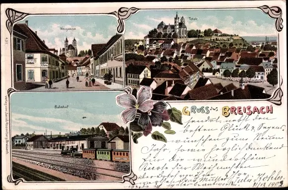 Litho Breisach am Oberrhein, Bahnhof, Gleisansicht, Neugasse, Totalansicht vom Ort