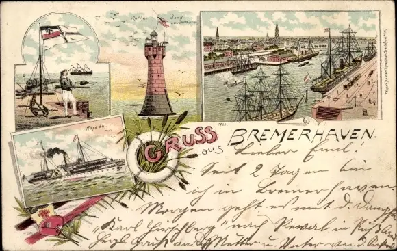 Litho Bremerhaven, Leuchtturm, Hafen, Segelschiffe, Seemann, Najade