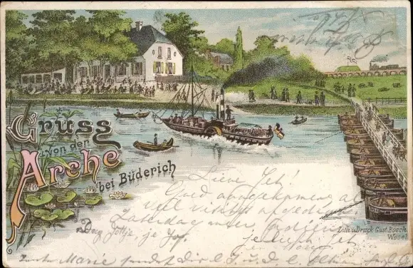 Litho Büderich Wesel am Niederrhein, Gasthaus Arche, Schiffbrücke, Dampfer